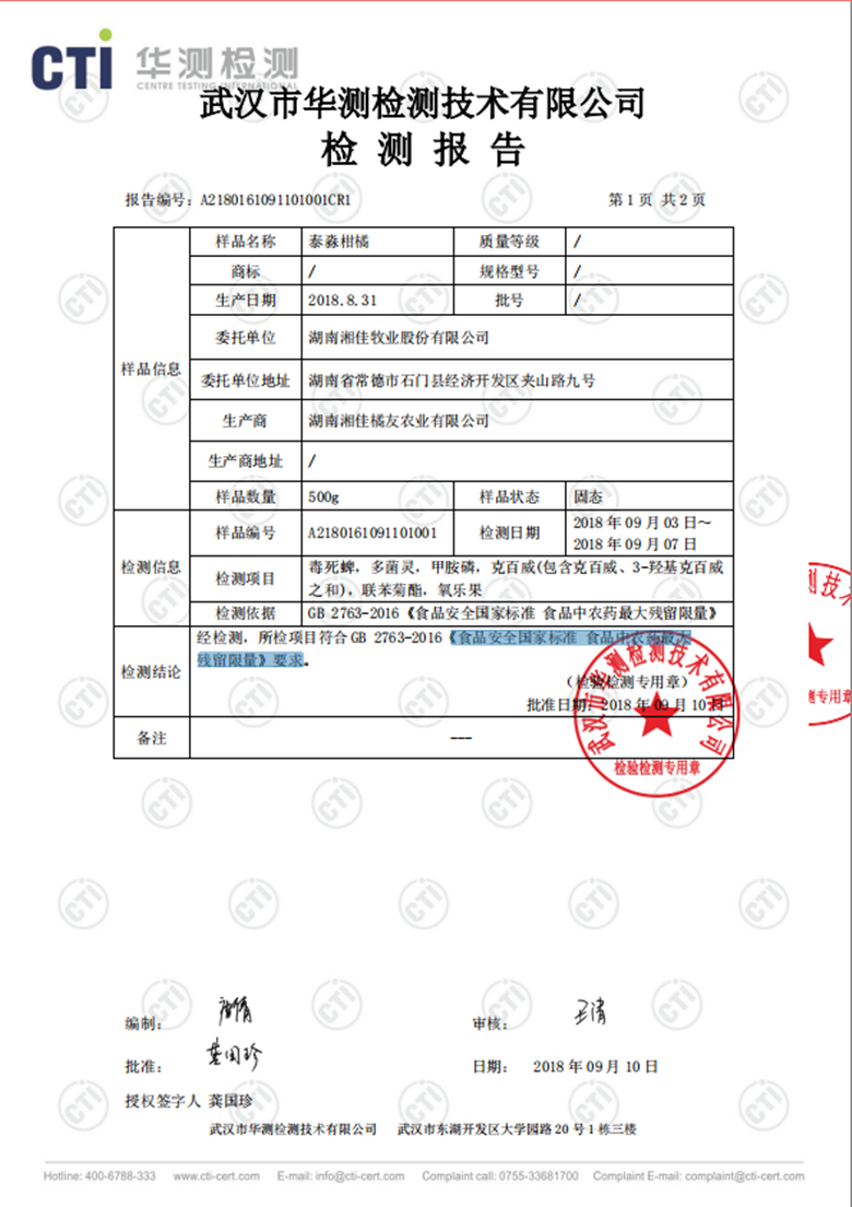 石門泰淼柑橘符合《食品安全國家標(biāo)準(zhǔn),食品中農(nóng)藥最大殘留限量》要求。