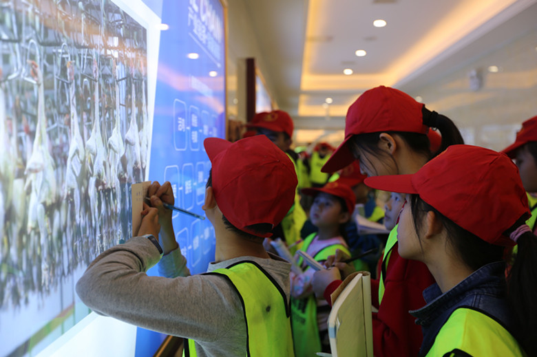 看著湘佳文化長廊櫥窗里的屠宰流程和兩位創始人喻自文、邢衛民的創業事跡,學生們不約而同拿出紙和筆記下,說這是最好的寫作素材和知識要點。