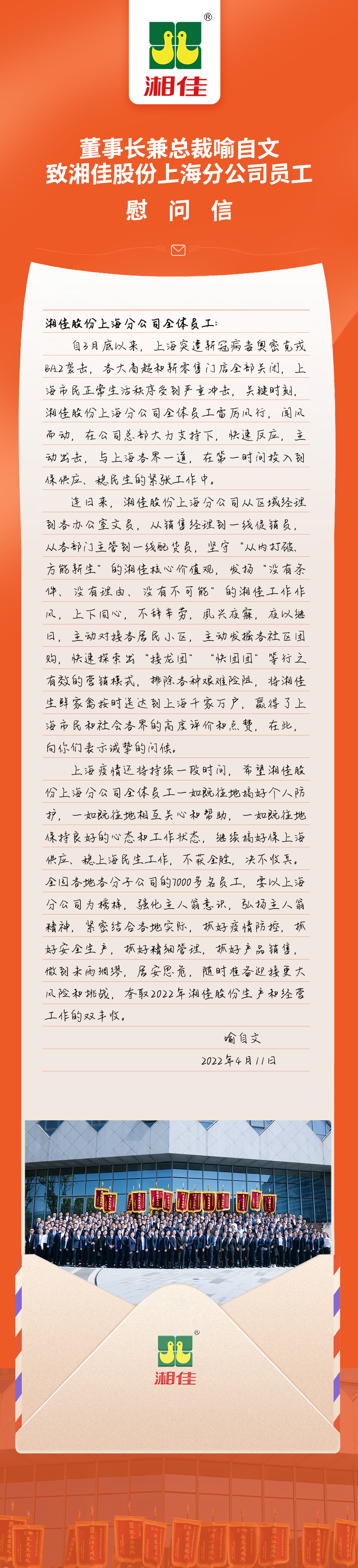 喻自文致湘佳股份上海分公司員工慰問信 發(fā)布人:文化部 發(fā)布日期:2022-04-11 5842次瀏覽 上一篇: 青春有我 筑夢湘佳|湘佳股份召開五四青年員工座談會 下一篇: 湘佳創(chuàng)業(yè)30周年慶祝大會:鳳領(lǐng)湘佳,五業(yè)齊飛